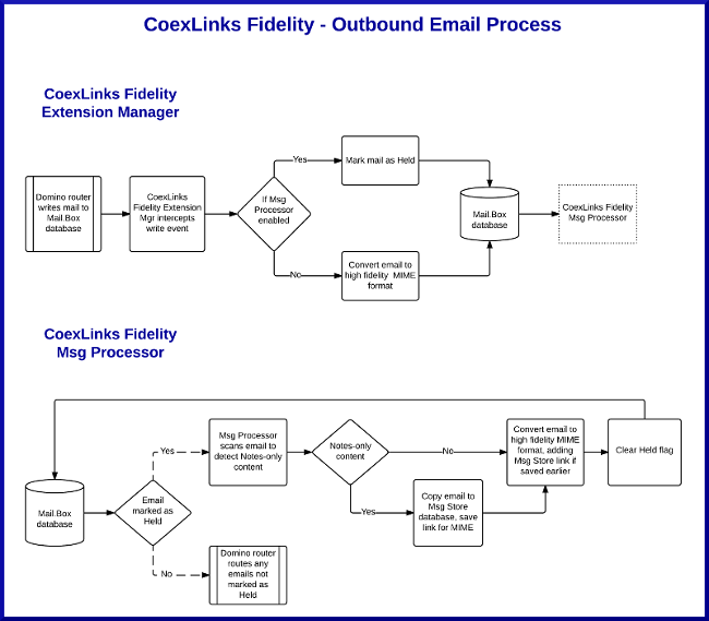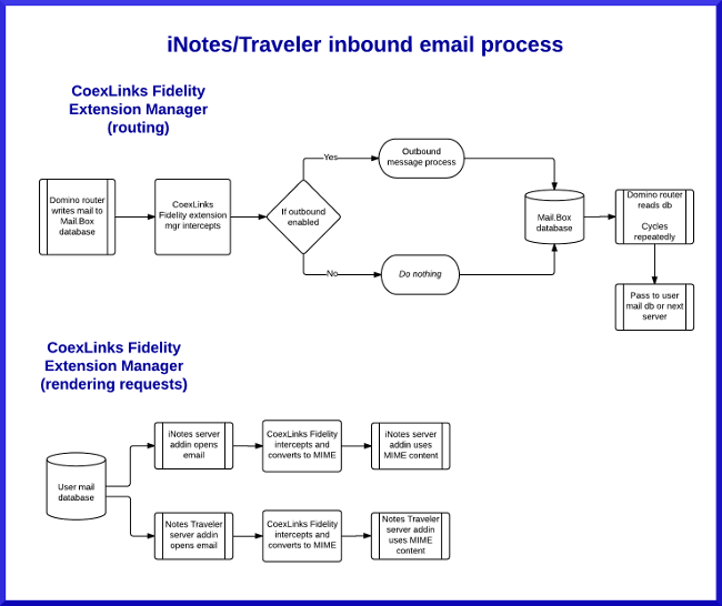 These show the flow of email within the Notes/Domino infrastructure, and the points at which that email is converted to MIME. Click on either flow diagram to see a larger version. |