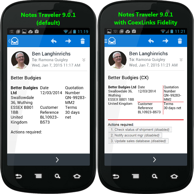 Click on the link -> iNotes sample mail database <- to see how emails are displayed on the web using iNotes as rendered by Domino or by CoexLinks Fidelity. Outbound and mobile emails can best be experienced by filling out the form below. |
